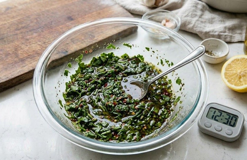 Unlike cooked sauces, chimichurri relies entirely on fresh ingredients. Everything is chopped, mixed, and allowed to rest so the flavors blend naturally.